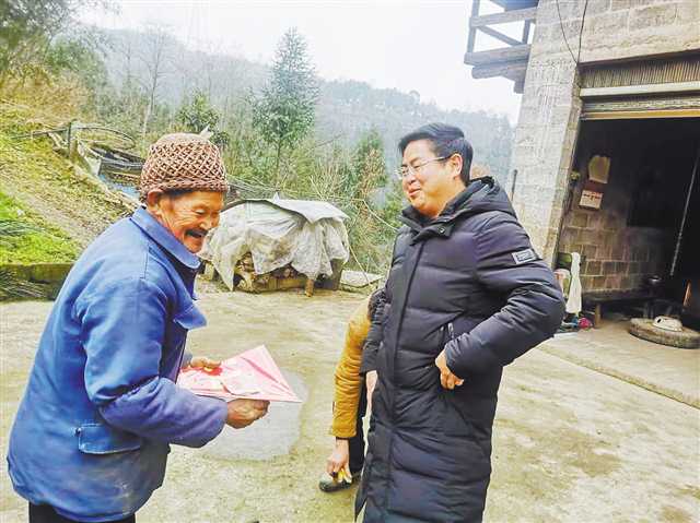 郭守順(右)到村民家走訪并送上春聯(lián)。(受訪者供圖)