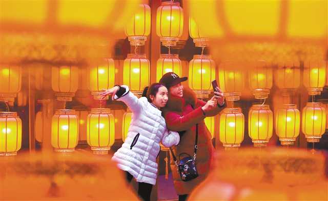 2月6日晚,黃桷椏老街,市民在一組燈籠前拍照留念。特約攝影 鐘志兵/視覺重慶