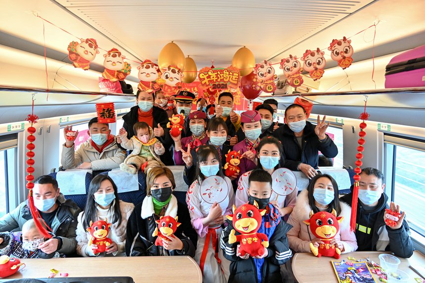 2月9日,C6409次列車上列車工作人員與旅客合影,并送出新春祝福。包亮攝