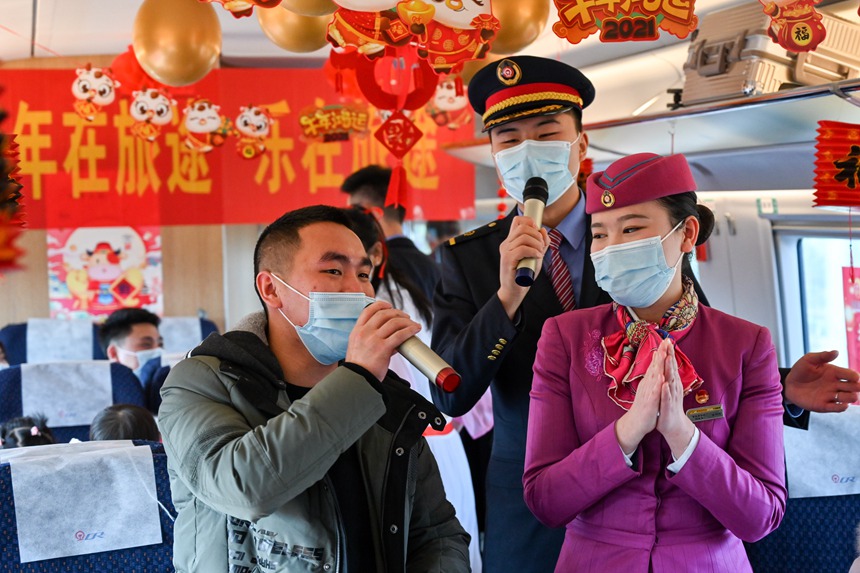 2月9日,C6409次列車上列車工作人員與旅客共同演唱。包亮攝