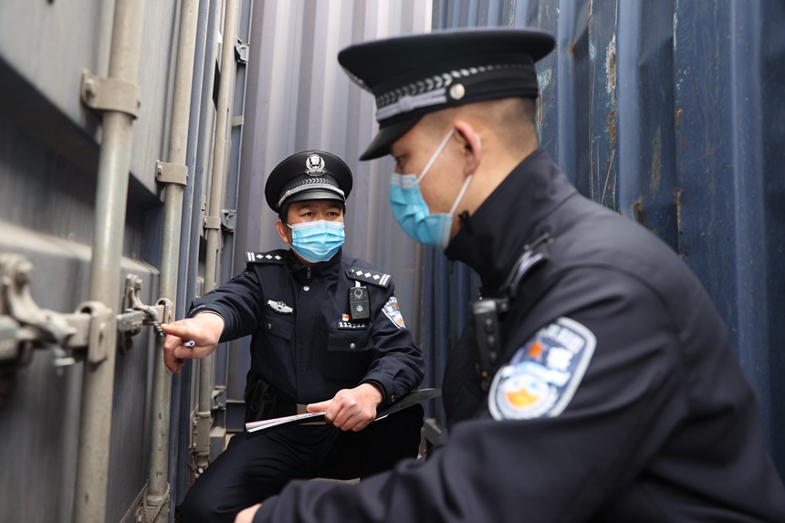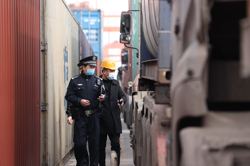 民警雷激(右)和同事對進(jìn)出中心站集裝箱裝載區(qū)貨車進(jìn)行巡查。胡勇攝