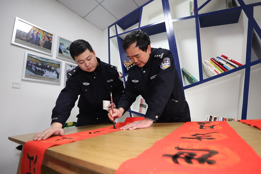 雷激(右)和同事書寫春聯(lián)迎新年。胡勇攝