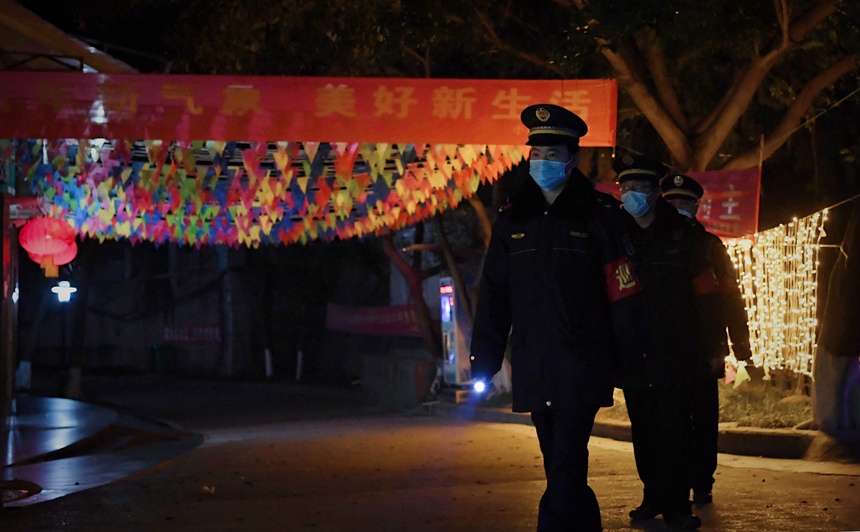 人民網(wǎng)重慶2月13日電(胡虹)除夕夜,在家人團(tuán)聚,迎接新春第一天的時(shí)候,重慶市九龍坡區(qū)楊家坪街道城市治理綜合巡查隊(duì)的隊(duì)員們,仍然在為保障市民的安全“壓馬路”。江邊、取水點(diǎn)、鐵路步道、龍鳳寺……為確保節(jié)日期間市政設(shè)施安全運(yùn)行,楊家坪街道城市治理綜合巡查隊(duì)120名隊(duì)員,春節(jié)期間無(wú)一人離渝,全部留守,50名隊(duì)員輪值排班,另20名隊(duì)員備勤待命。除夕夜(2月11日)當(dāng)晚,為讓市民安心過(guò)年,城市治理綜合巡查隊(duì)的隊(duì)員就不停地在自己負(fù)責(zé)的區(qū)域,定時(shí)、定點(diǎn)排查火災(zāi)、安全隱患,從晚上8:00接班到大年初一(2月12日)早上8:00換班,他們堅(jiān)守崗位,做好城市的“守夜人”。