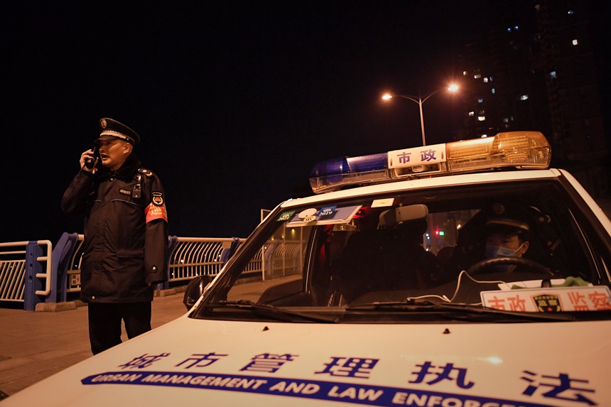 除夕夜,重慶市九龍坡區(qū)楊家坪街道城市治理綜合巡查隊(duì)的隊(duì)員們正在路面巡查。周舸攝