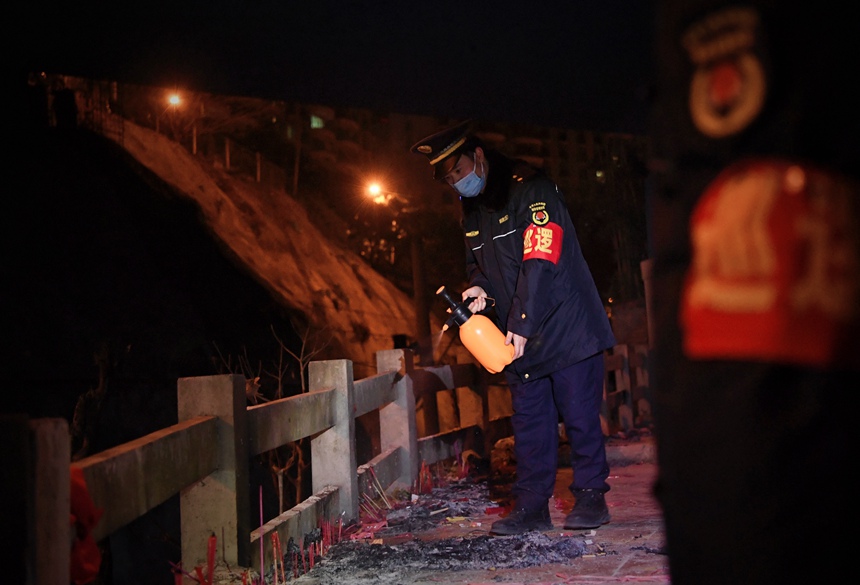 因疫情防控,重慶今年各大寺廟春節(jié)期間暫停對(duì)外開(kāi)放。除夕夜,在巡查的過(guò)程中,城市治理綜合巡查隊(duì)隊(duì)員在龍鳳寺附近發(fā)現(xiàn)市民祭祀結(jié)束離開(kāi)后,仍在燃燒的香燭,為杜絕火災(zāi)隱患,隊(duì)員用噴水壺將火澆滅。周舸攝