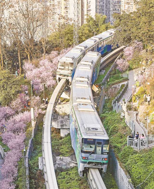 二月十九日下午,軌道交通二號線渝中區(qū)佛圖關段,單軌列車穿梭在花海中。記者 蘇思 攝\視覺重慶