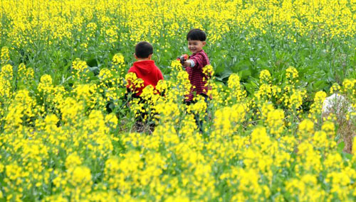 2月23日,在閩侯縣鴻尾鄉(xiāng)鴻尾村的油菜花種植示范基地,兩名小朋友在油菜花田里玩耍。新華社記者 魏培全 攝