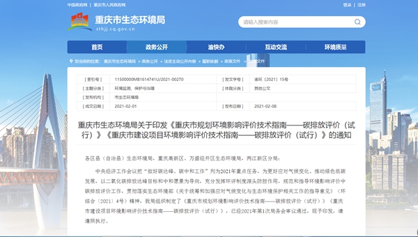 重慶市生態(tài)環(huán)境局官網(wǎng)截圖。