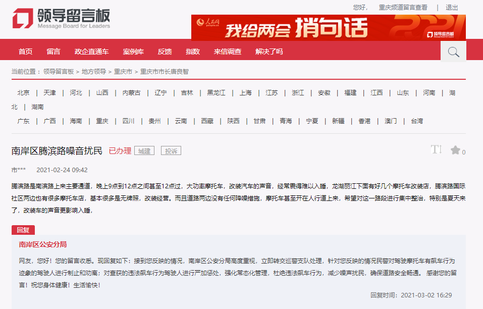 人民網(wǎng)重慶3月5日電(陳琦) 近日,有網(wǎng)友通過人民網(wǎng)《領(lǐng)導(dǎo)留言板》留言,反映南岸區(qū)騰濱路夜間大功率摩托車,改裝汽車噪音擾民問題,希望相關(guān)部門進(jìn)行集中整治。對(duì)此,南岸區(qū)公安局進(jìn)行了回復(fù)。
