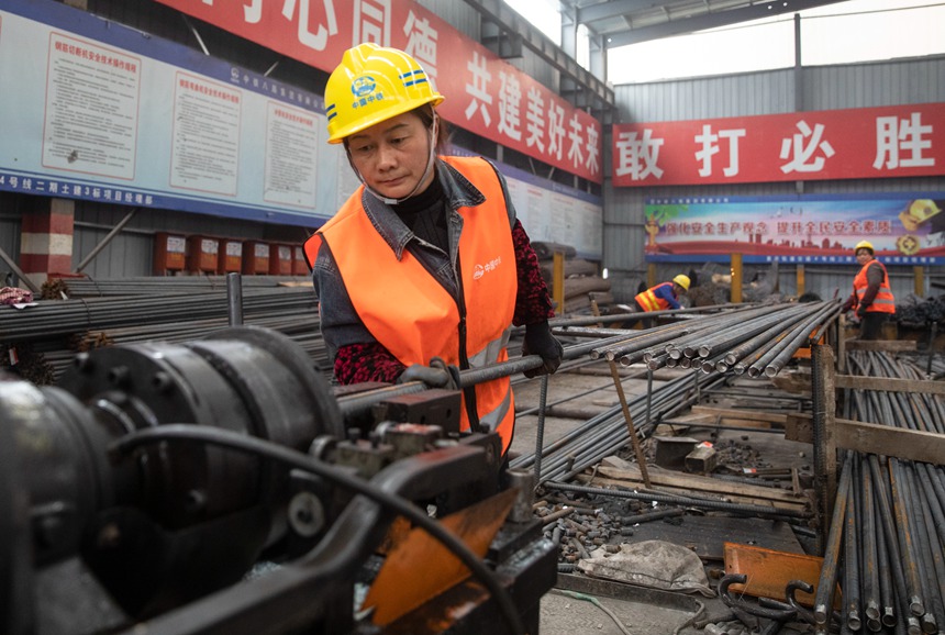在重慶軌道4號(hào)線二期土建三標(biāo)鋼筋加工廠,現(xiàn)場(chǎng)火花四濺,一派繁忙,幾名女工忙碌的身影卻格外顯眼。她們就是來(lái)自中鐵八局的鋼筋加工娘子軍,也是工友們口中的“鋼花”。