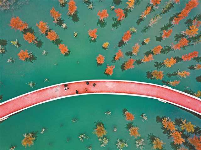 萬州區(qū)大周鎮(zhèn)十里濱江長廊,中山杉林顏色繽紛,形成了美麗的沿江風景,不少游客慕名而來。(攝于2020年12月18日)記者 謝智強 攝/視覺重慶