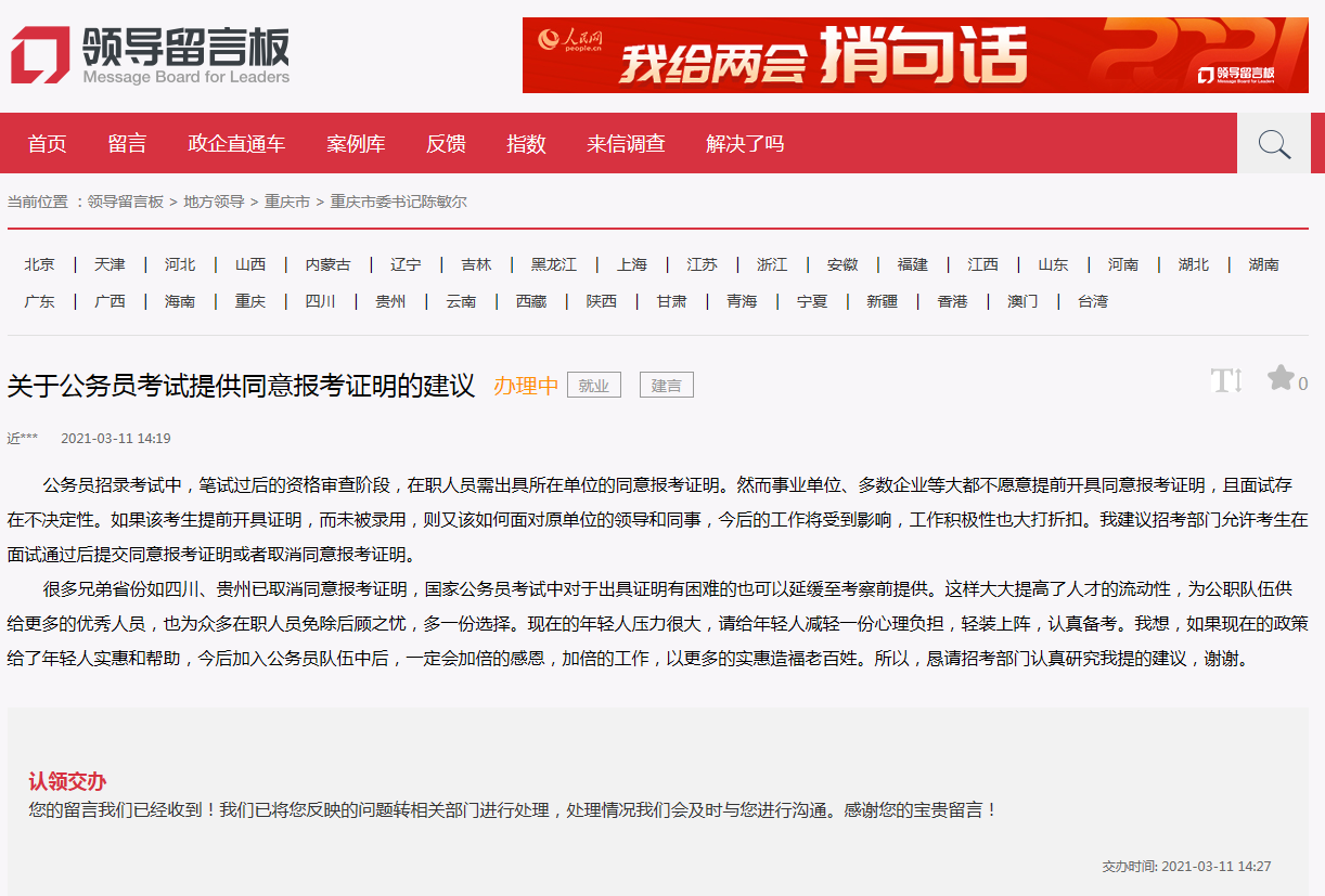 人民網重慶3月12日電(陳琦)“建議招考部門允許考生在面試通過后,再提交所在單位同意報考證明或者取消同意報考證明!3月11日,有網友通過人民網《領導留言板》給重慶市委書記陳敏爾建議。