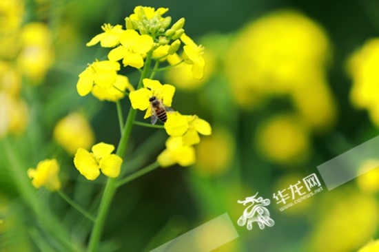 紅色榆葉梅鑲嵌在金燦燦的油菜花海中。