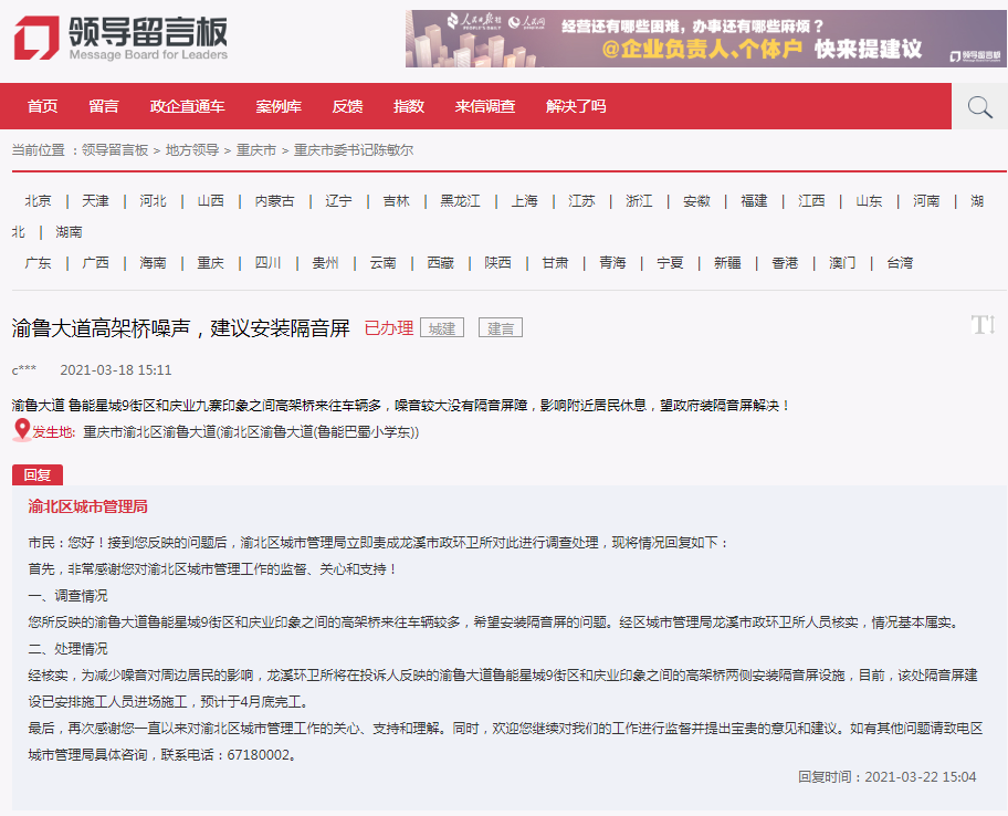 為減少噪音對周邊居民的影響,渝北區(qū)龍溪環(huán)衛(wèi)所將在投訴人反映的渝魯大道魯能星城9街區(qū)和慶業(yè)印象之間的高架橋兩側(cè)安裝隔音屏設(shè)施。目前,該處隔音屏建設(shè)已安排施工人員進場施工,預(yù)計于4月底完工。