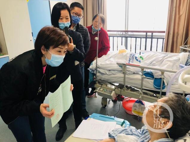 “老人家你不要著急,只需要回答是或者不是就行,我們會全程視頻記錄!碑(dāng)天,登記復(fù)核科王馨、受理審查科盛登梅等工作人員手持執(zhí)法記錄儀,一進入病房,耐心詢問、確認(rèn)服務(wù)對象是否能夠自主表達(dá)真實意愿,隨后指導(dǎo)當(dāng)事人填寫申請表格,拍照留存等。與此同時,與服務(wù)對象無利害關(guān)系第三方也到場見證并在資料上簽字。