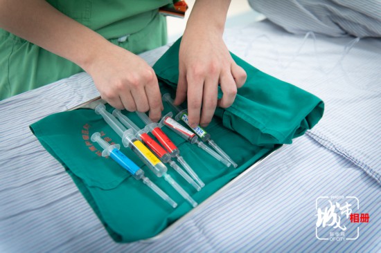 一踏進(jìn)手術(shù)室,劉夢虓和同事們就開始了緊張而忙碌的準(zhǔn)備工作。他們需要檢查各種設(shè)備儀器功能是否正常,還要準(zhǔn)備各種藥物,每一種藥都要提前抽到針管里并貼上標(biāo)簽備用!斑@樣的準(zhǔn)備工作必須在患者進(jìn)入手術(shù)室前完成,每次需要大概半個(gè)小時(shí)。只有手術(shù)前充分準(zhǔn)備,才能臨危不亂!毙氯A網(wǎng) 耿駿宇 攝 陳雨 文