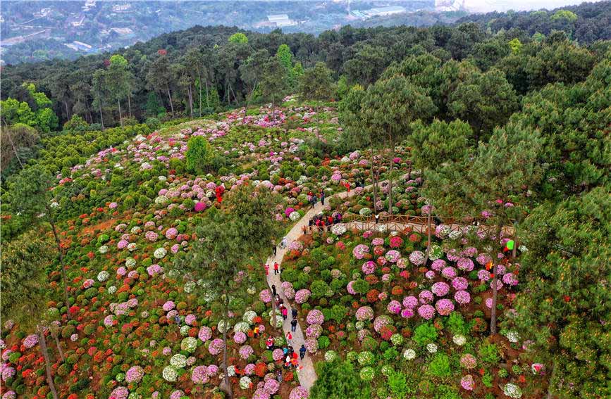 人民網(wǎng)重慶4月1日電 (常碧羅、陳琦)人間四月天,繁花似錦時。連日來,重慶南岸區(qū)南山街道放牛村的百畝杜鵑花在林蔭下競相綻開,村莊變成花的海洋,吸引不少游客賞花踏春帶火了鄉(xiāng)村旅游。芳菲四月,嬌艷的杜鵑花和高大的松林相映成趣,游客穿行其間,仿佛走進了現(xiàn)實版“綠野仙蹤”。