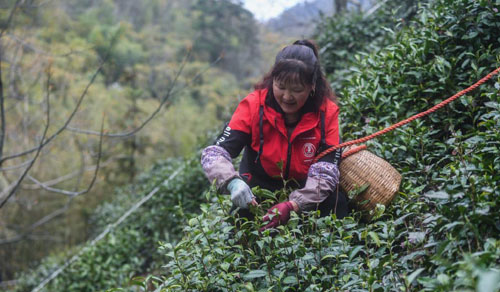4月1日,茶農(nóng)在東坑村的山坡上沿著繩索采摘第一批高山有機(jī)茶。新華社記者 徐昱 攝