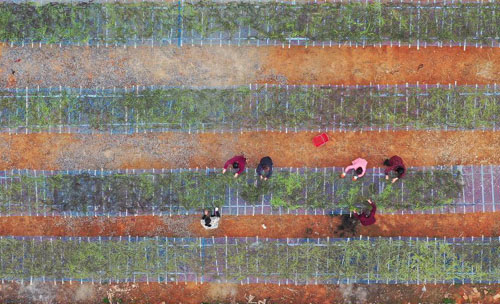 4月1日,村民在衡陽市衡東縣楊橋鎮(zhèn)虎塘村晾曬蕨菜(無人機(jī)照片)。