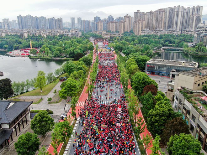 本屆馬拉松賽道選址永川城區(qū),賽道平坦廣闊。在比賽中,選手們途經(jīng)興龍湖、人民大道、觀音山公園等永川地標(biāo)景點(diǎn),在奔跑中欣賞到了永川“三面青山、六水環(huán)繞、九湖美景”的城市風(fēng)采。