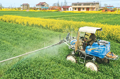 隨著天氣轉(zhuǎn)暖,江蘇省海安市隆政街道聯(lián)合村俞萬(wàn)家庭農(nóng)場(chǎng)的小麥長(zhǎng)勢(shì)良好,進(jìn)入拔節(jié)抽穗的關(guān)鍵時(shí)期。當(dāng)?shù)卮迕駬屪マr(nóng)時(shí),利用植保機(jī)對(duì)小麥進(jìn)行防病害作業(yè),為夏糧增產(chǎn)增收打下基礎(chǔ)。圖為聯(lián)合村村民對(duì)小麥進(jìn)行防病害作業(yè)。