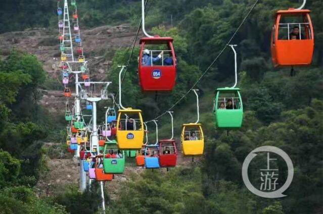 4月5日上午10點,景區(qū)9.99元索道入口處的游客排成了長龍。游客坐著跨江索道,登上美心紅酒小鎮(zhèn)景區(qū)的泡桐村山頂游山、觀水,玩得不亦樂乎。