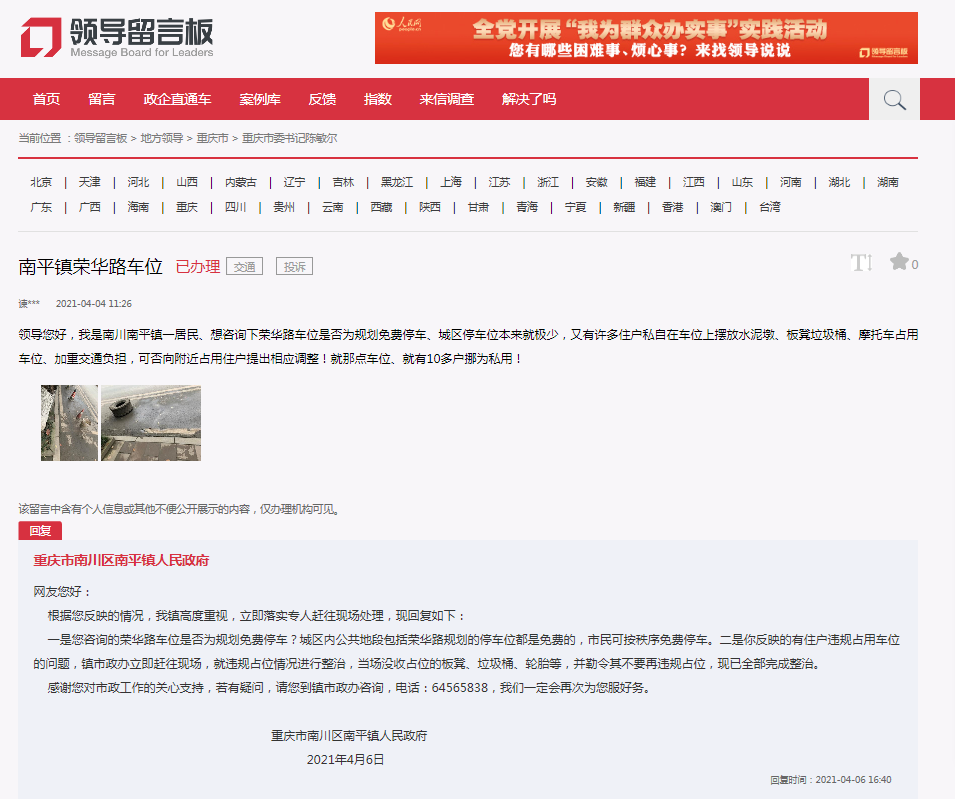 針對留言,南川區(qū)南平鎮(zhèn)政府回復(fù)稱:榮華路段屬于城區(qū)公共地段,市民可按秩序免費(fèi)停車。對于有住戶違規(guī)占用車位的問題,南平鎮(zhèn)市政辦現(xiàn)場對違規(guī)占位情況進(jìn)行了整治,當(dāng)場沒收占位的私人物品,并勒令其不再違規(guī)占位。
