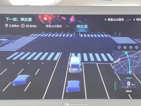 車廂前方電子屏360°無(wú)死角顯示自動(dòng)駕駛公交車運(yùn)行情況。謝佳潔攝