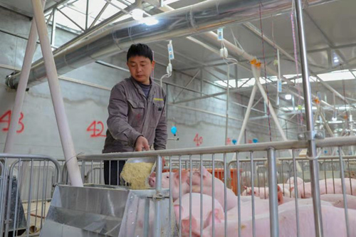 飼養(yǎng)員正在給豬喂食。譚啟云攝