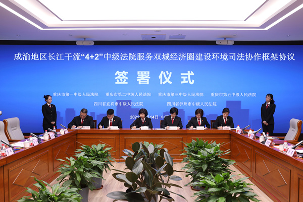 按照當(dāng)日簽署的《成渝地區(qū)長(zhǎng)江干流“4+2”中級(jí)法院服務(wù)雙城經(jīng)濟(jì)圈建設(shè)環(huán)境司法協(xié)作框架協(xié)議》,六家法院將通過建立跨區(qū)域環(huán)資司法日常聯(lián)絡(luò)機(jī)制、跨區(qū)域環(huán)資案件訴訟服務(wù)機(jī)制、跨區(qū)域環(huán)資案件調(diào)研交流機(jī)制、跨區(qū)域環(huán)資案件執(zhí)行合作機(jī)制、跨區(qū)域“司法+行政”生態(tài)環(huán)境資源協(xié)同治理機(jī)制、跨區(qū)域環(huán)資人才共享機(jī)制、跨區(qū)域環(huán)資信息互通機(jī)制、跨區(qū)域環(huán)境司法聯(lián)合宣傳機(jī)制這八項(xiàng)合作機(jī)制,形成環(huán)境資源司法訴訟服務(wù)“同城標(biāo)準(zhǔn)”、執(zhí)法辦案“同城效應(yīng)”。
