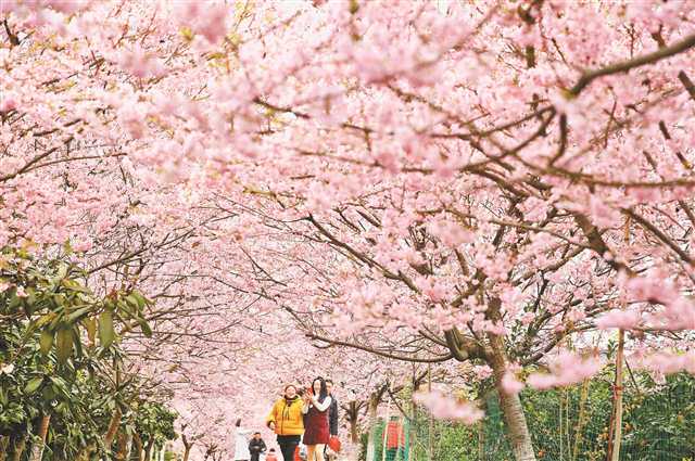 2019年2月16日,北碚區(qū)澄江鎮(zhèn)五一村“櫻花橘香”農(nóng)業(yè)公園,市民欣賞盛開的櫻花。特約攝影 秦廷富/視覺重慶
