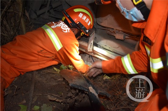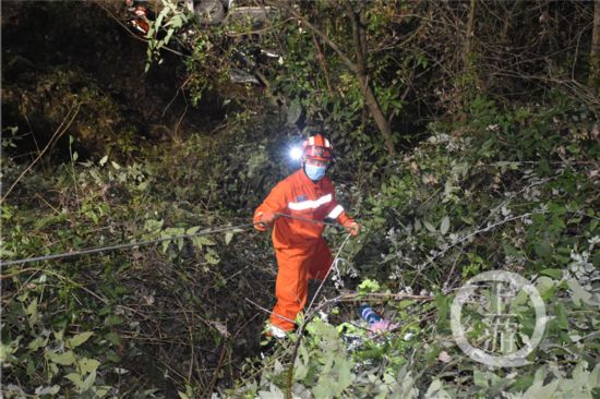 為盡快抵達事故車輛旁,消防救援人員立即兵分兩路,一路通過架設(shè)繩索直接穿過荊棘叢下滑到事故車輛旁偵查情況。另一路則攜帶救援器材,與村民一起尋找可以抵達事故位置的小路。兩分鐘后,第一組指戰(zhàn)員利用繩索來到越野車旁。此時救援人員了解到,村民已經(jīng)對車輛附近進行了搜尋,排除了嬰兒摔落在車輛附近的可能,村民還告訴救援人員,此前若隱若現(xiàn)的啼哭聲也可以判斷,嬰兒應(yīng)該就在側(cè)翻車輛的下方。