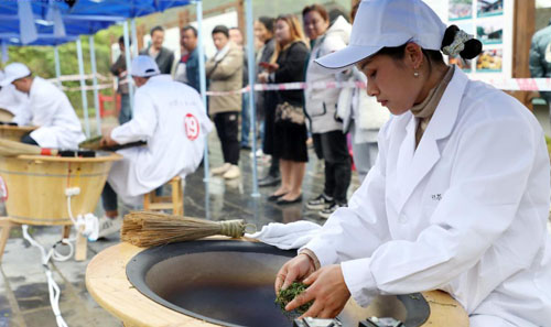 4月20日,參賽選手在比賽現(xiàn)場(chǎng)手工制茶。