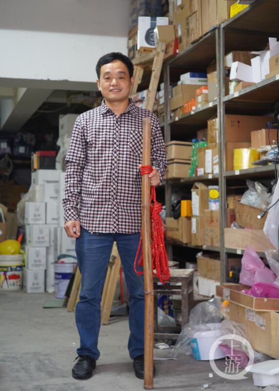 他還保留著當(dāng)年那根“棒棒”,上面掛著的繩是他自己編的,“棒棒”上能看到多年前的汗?jié)n和劃痕?,F(xiàn)在,經(jīng)常遇到公司需要搬貨,他為了替公司省錢,就自己擔(dān)起“棒棒”擔(dān)貨。楊闊嫻熟地用將重物用繩結(jié)套住,“棒棒”往肩上一扛,跨著穩(wěn)健的步伐大步往前走。