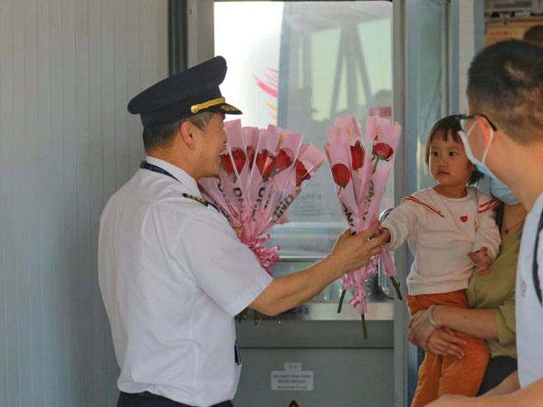 飛機(jī)平穩(wěn)降落重慶機(jī)場后,李晶走出駕駛艙,站在艙門前與旅客握手告別,機(jī)組成員和旅客們把寫有祝福語的小紙條和鮮花送給李晶。