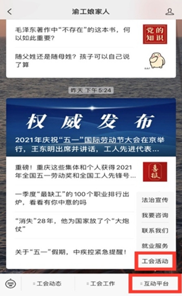 市民可關(guān)注“渝工娘家人”微信公眾號(hào),點(diǎn)擊首頁右下角“互動(dòng)平臺(tái)”進(jìn)入“工會(huì)活動(dòng)”參與活動(dòng)。重慶市總工會(huì)供圖