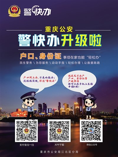 江北警方提醒,線下18個派出所照,F(xiàn)場辦理戶政業(yè)務(wù),老年優(yōu)先服務(wù)照常執(zhí)行。線上共有兩大注冊途徑:途徑一:在手機應(yīng)用商店搜索“警快辦”APP,點擊下載、安裝,然后完成注冊登錄(注冊地選擇江北區(qū))、實名認證。途徑二:通過關(guān)注微信公眾號“平安重慶”,進入“警快辦”界面,然后完成注冊登錄(注冊地選擇江北區(qū))、實名認證。(重慶晚報-上游新聞記者 彭光瑞 警方供圖)