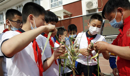 5月10日,學(xué)生們?cè)诿耖g藝人指導(dǎo)下體驗(yàn)草編。