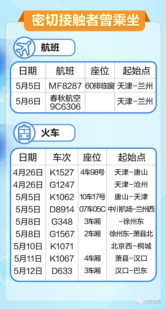 據(jù)公開報道,本輪疫情發(fā)生以來,各地發(fā)布了確診病例和密切接觸者的行程軌跡詳情,他們所乘坐的航班和火車班次如下,請乘坐這些航班和火車的人員及時向所在地社區(qū)(村委會)報告。