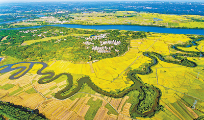 夏收時節(jié),海南省?谑协偵絽^(qū)云龍鎮(zhèn)三十六曲溪濕地公園稻浪翻滾,一片片成熟的稻田與蜿蜒曲折的河道交織成一幅美景。目前河道南邊的早稻大部分已收割完畢,北邊的早稻正待開鐮。