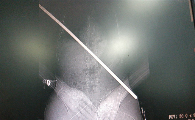 術(shù)中,打開胸腔和腹腔,發(fā)現(xiàn)傷者右肺臟已被鋼筋穿透,鋼筋緊貼脊柱,隔肌、橫結(jié)腸及小腸系膜等被貫通,幸運(yùn)地是鋼筋避開了心臟,從下腔靜脈后方、腹主動(dòng)脈前方穿過。術(shù)中還由消化內(nèi)科文良志副教授行胃鏡檢查排除了食管損傷。放射影像科曹瑞、王承諾技師利用先進(jìn)的移動(dòng)CT在手術(shù)室行頭顱CT檢查進(jìn)一步排除了嚴(yán)重的顱腦損傷。
