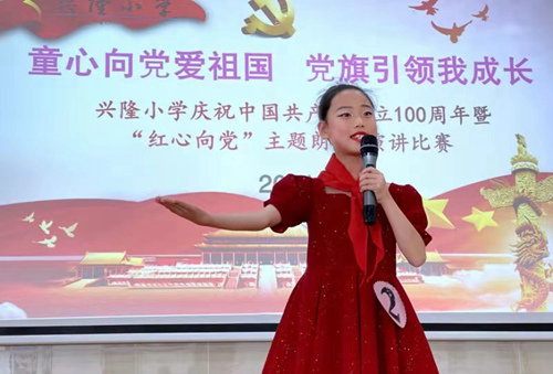 人民網(wǎng)重慶5月19日電 為慶祝中國(guó)共產(chǎn)黨建黨100周年,讓孩子們從小了解黨、熱愛(ài)黨、心向黨,近日,渝北興隆小學(xué)在渝北區(qū)興隆鎮(zhèn)文化服務(wù)中心舉行“童心向黨愛(ài)祖國(guó),黨旗引領(lǐng)我成長(zhǎng)”主題演講、朗誦比賽,把紅色的“種子”撒播在孩子們的心中。