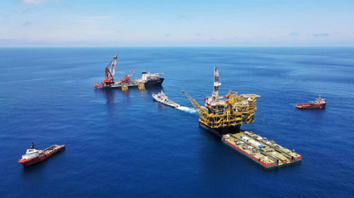 正在進(jìn)行浮托安裝的陸豐14-4中心平臺(tái)。受訪者供圖