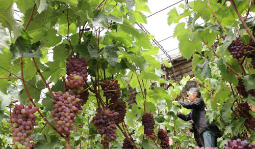 5月23日,農(nóng)民在河北省平泉市道虎溝鄉(xiāng)雙峰社區(qū)一處設(shè)施葡萄大棚里采摘茉莉香葡萄。