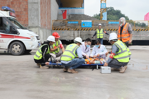 “立即啟動火災(zāi)事故應(yīng)急預(yù)案,撥打報警電話,通知各救援小組立即趕赴現(xiàn)場!”隨著項目經(jīng)理秦自力的一聲令下,工地各應(yīng)急救援小組及時趕到“事故現(xiàn)場”,拉起警戒線,有序疏散人員并對傷員展開緊急救援。隨后,醫(yī)療人員與消防官兵也及時趕到了現(xiàn)場,對傷員進(jìn)行治療,迅速撲滅火源。
