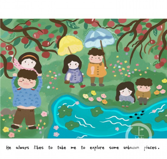 為完成這件作品,她采訪了外婆、媽媽和弟弟的同學(xué),分別了解他們童年的記憶!暗艿艿幕卮鹗亲钕矚g和同學(xué)玩ipad游戲。我很喜歡媽媽那個(gè)年代的童年,他們?cè)谏街斜M情玩耍,下河摸魚,上樹(shù)采果,跳橡皮筋……很幸運(yùn)我的童年也很快樂(lè),因?yàn)槭恰硼B(yǎng)式’的。”婧喜笑道。