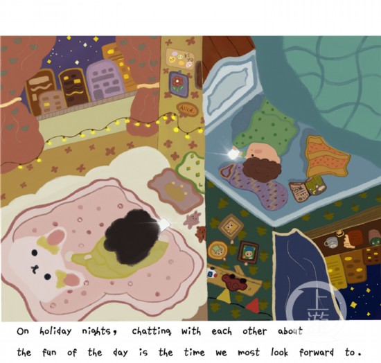 她學(xué)習(xí)畫畫其實(shí)僅一年多,但賦予了情感和感悟的畫作,卻充滿了靈動(dòng)。在高三申請(qǐng)藝術(shù)院校時(shí),需要交作品集。她創(chuàng)作了三件作品,其中一件就花了三個(gè)月時(shí)間,將自己和男朋友的故事畫成插畫,色彩斑瀾,富有童趣。 “很多學(xué)生談戀愛(ài)都是躲躲藏藏,連男女生單獨(dú)說(shuō)個(gè)話,老師都會(huì)干涉!彼J(rèn)為,校園戀情其實(shí)大都純真又簡(jiǎn)單,家長(zhǎng)和老師們不必過(guò)于擔(dān)心,她希望用畫筆描述這樣真摯又美好的情感。
