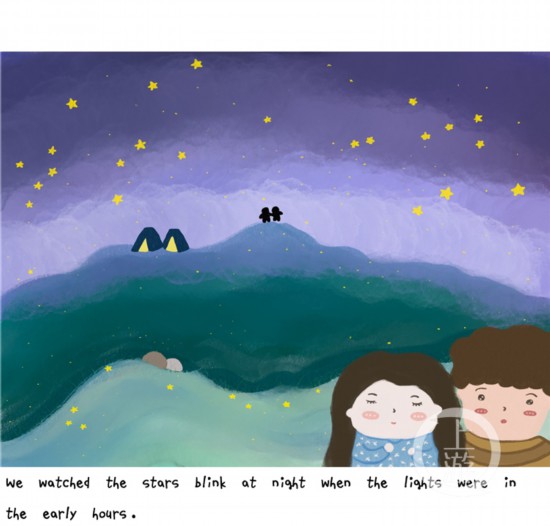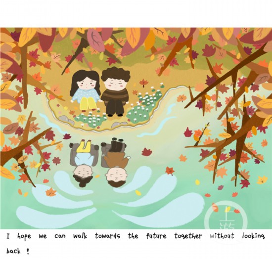 在插畫中,她畫出和男孩安靜地坐在一起,水里的倒影是兩人老了以后的樣子。“他總會(huì)在我害怕或難過(guò)時(shí)保護(hù)我!薄霸诩倨诘耐砩,打電話彼此聊著這一天的趣事,是我們最期待的!痹诶铈合驳墓P下,這份純潔的戀愛(ài),像一條點(diǎn)綴著彩虹的小路,甜美又帶有憧憬地輕輕鋪開(kāi)。