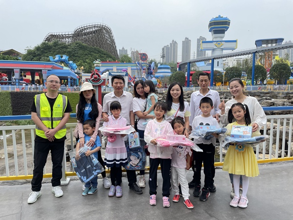 重慶歡樂(lè)谷的參建工人和他們的孩子們來(lái)到歡樂(lè)谷二期超級(jí)飛俠主題區(qū)游玩。中建五局三公司供圖