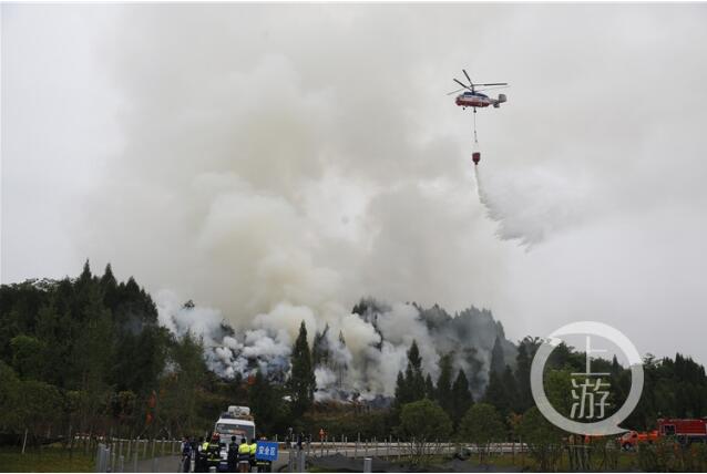 更多的應急救援隊伍前往現場,其中還有“空中部隊”前來支援——3架滅火無人機分別利用滅火劑對懸崖火點、煙點開展垂直噴滅作業(yè);卡-32直升機采用吊桶滅火的方式,將5噸水從空中拋灑,形成長100米、寬10米的水帶,對火場內的高強度火線、火頭進行壓制。